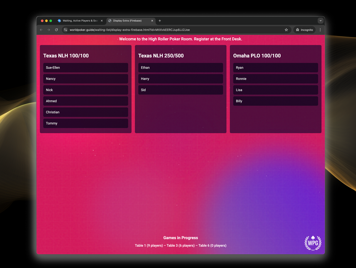 Behind the Scenes for Staff On the dealer’s side, the admin console is your command center. See at a glance exactly who’s on the waiting list, which tables have open seats, and who’s next in line. Drag‑and‑drop players into open seats to instantly update both the floor display and everyone’s phones. Need to bump a VIP or reorder by buy‑in level? Just click and drag—the list reorganizes in real time. And because it’s browser‑based, you can run it on any device: PC, tablet or even a wall‑mounted kiosk.